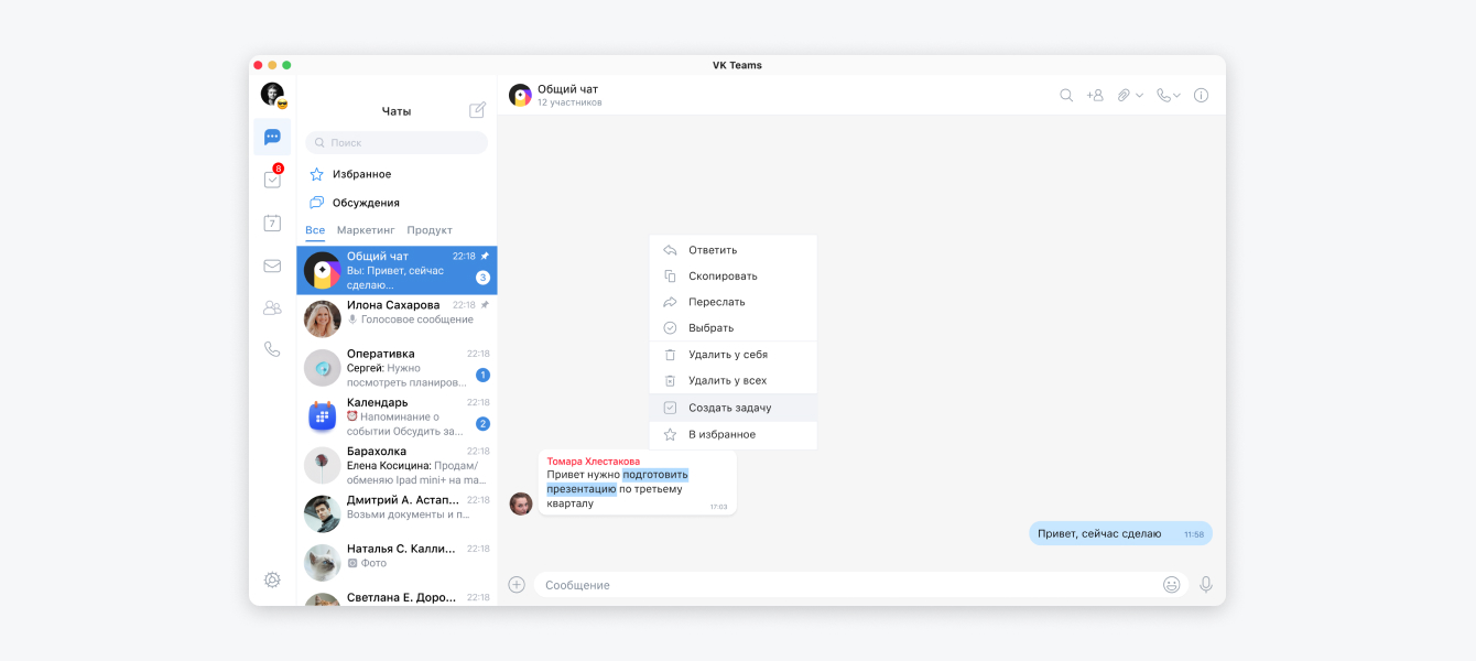 В мессенджере помимо обычных тредов есть ещё и «Сквозные» треды — в них можно отметить тегом сотрудника, даже если его нет в конкретном чате. Опция позволяет не плодить лишние чаты и не заниматься «пинг-понгом» сообщений с коллегами из разных отделов. Например, если нужно попросить программиста поставить метрику на сайт, можно отметить его через значок «@» в чате с маркетологами, где вы обсуждали эту задачу.